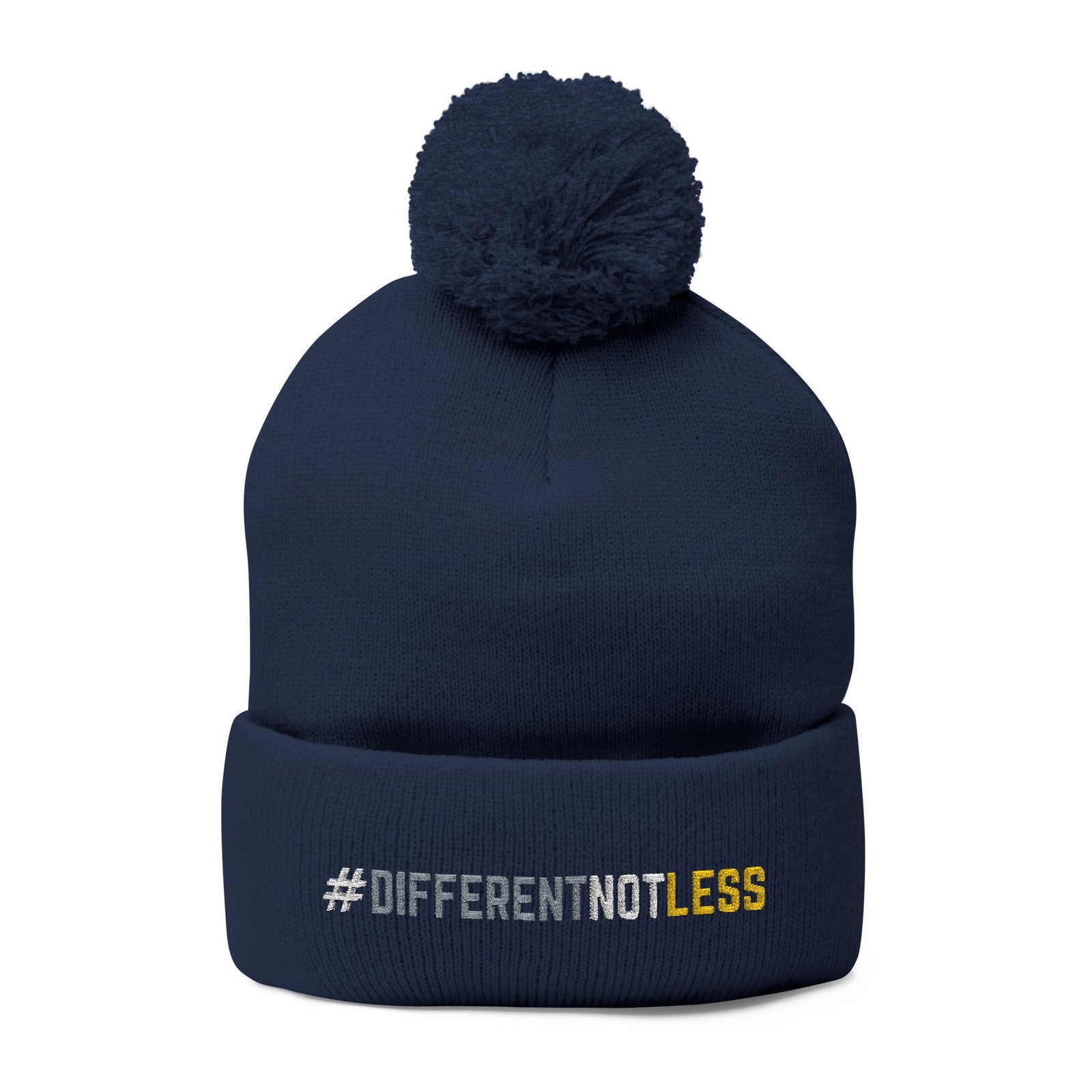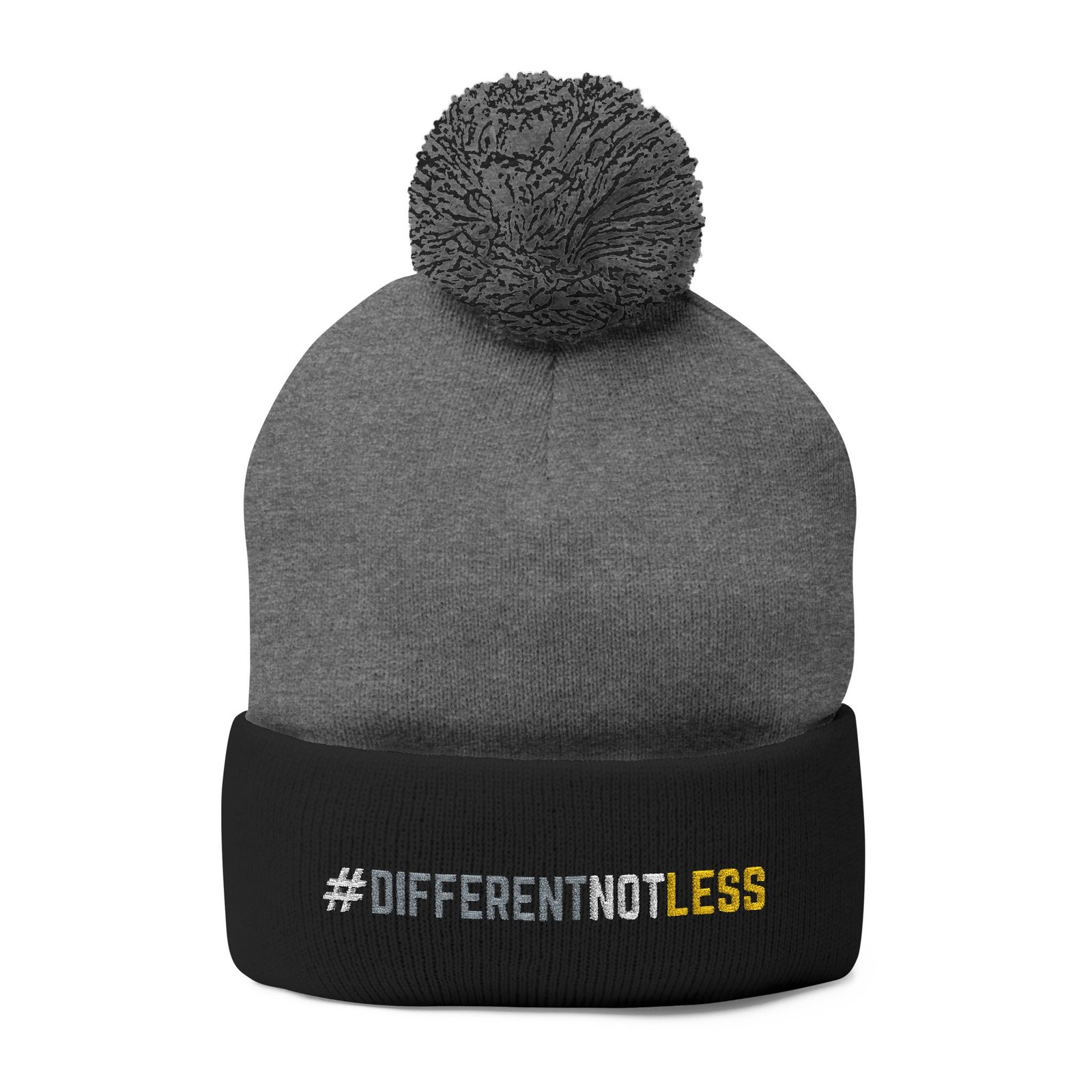 Stay warm. Stand for inclusion. This “Different Not Less” embroidered pom pom beanie is a bold yet classic way to show your support for disability awareness and inclusive communities. Stitched on the front cuff of the premium Sportsman SP15 Pom Pom Beanie, the design offers a clean, high-quality embroidered finish that won’t fade or peel.